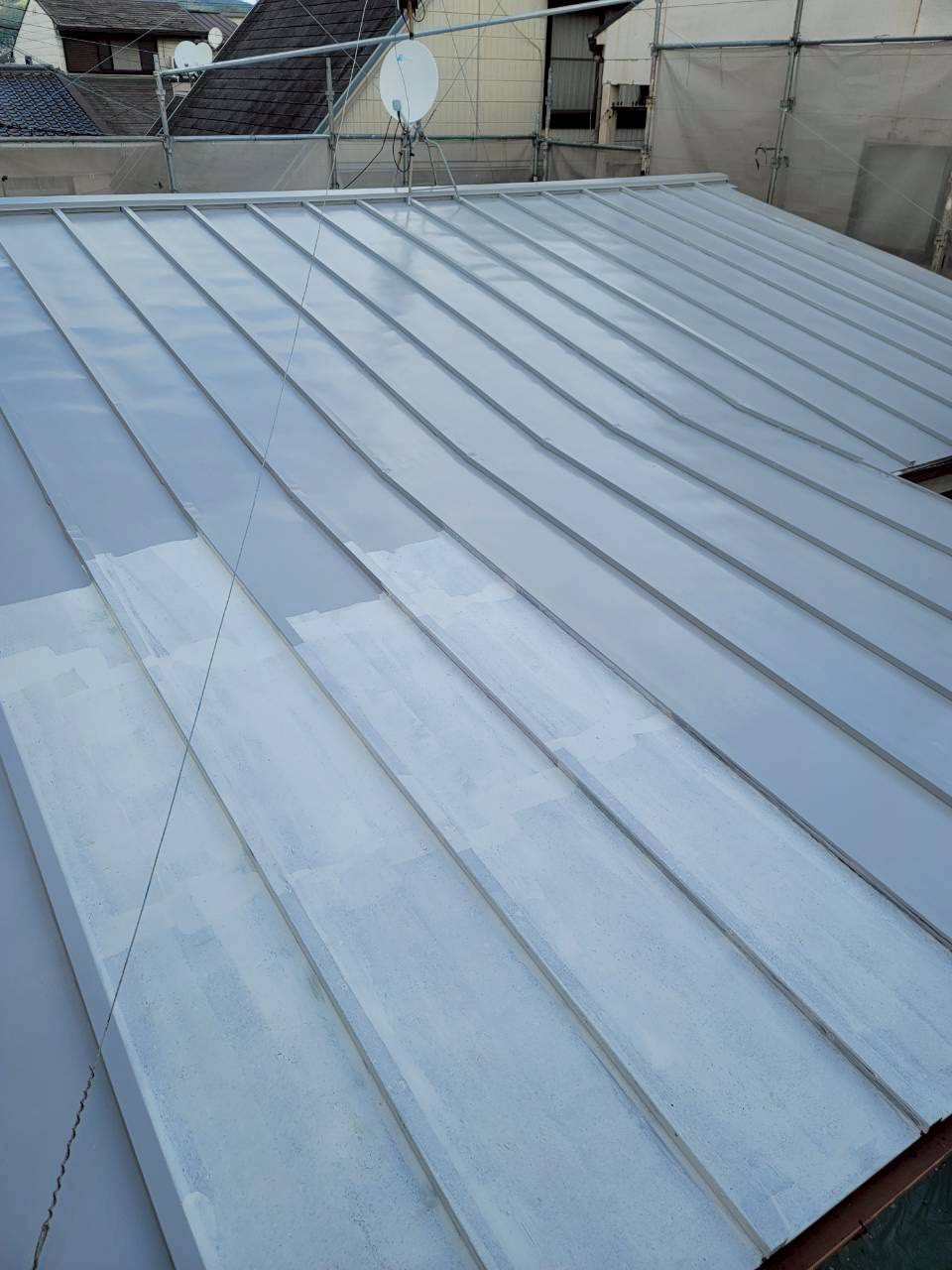 洗浄後は、金属面のサビや浮いた塗膜を削り落とすケレン作業を実施しました。写真でも、白くなった部分が錆止め塗装の工程で、均一に仕上がるよう慎重に塗り進めています。凹凸のある瓦棒屋根では刷毛とローラーを使い分け、細部にも塗り残しが出ないよう丁寧に施工しました。