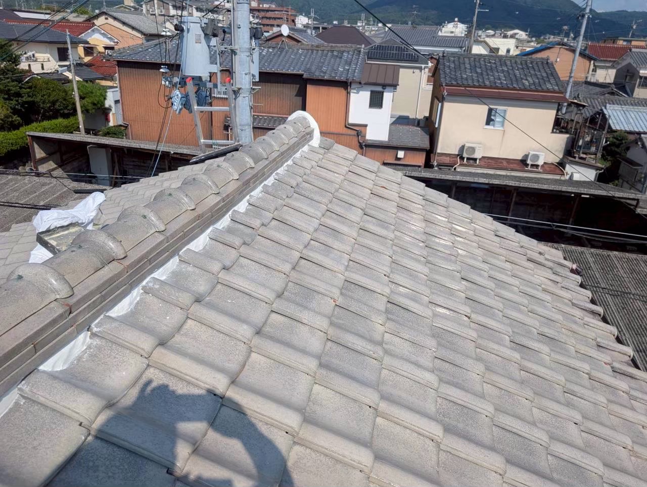 古い漆喰を撤去した後、新しい漆喰を棟下にしっかりと塗り込んでいきます。写真からも、白く均一な漆喰が棟下に美しく整えられている様子がわかります。**漆喰は強度と防水性を両立する素材であり、正しく施工することで屋根の耐久性が大きく向上します。**今回は伝統的な白漆喰を使用し、瓦との馴染みも良い仕上がりとなりました。